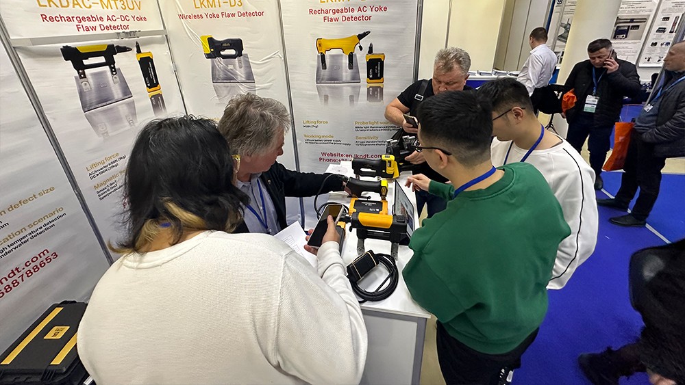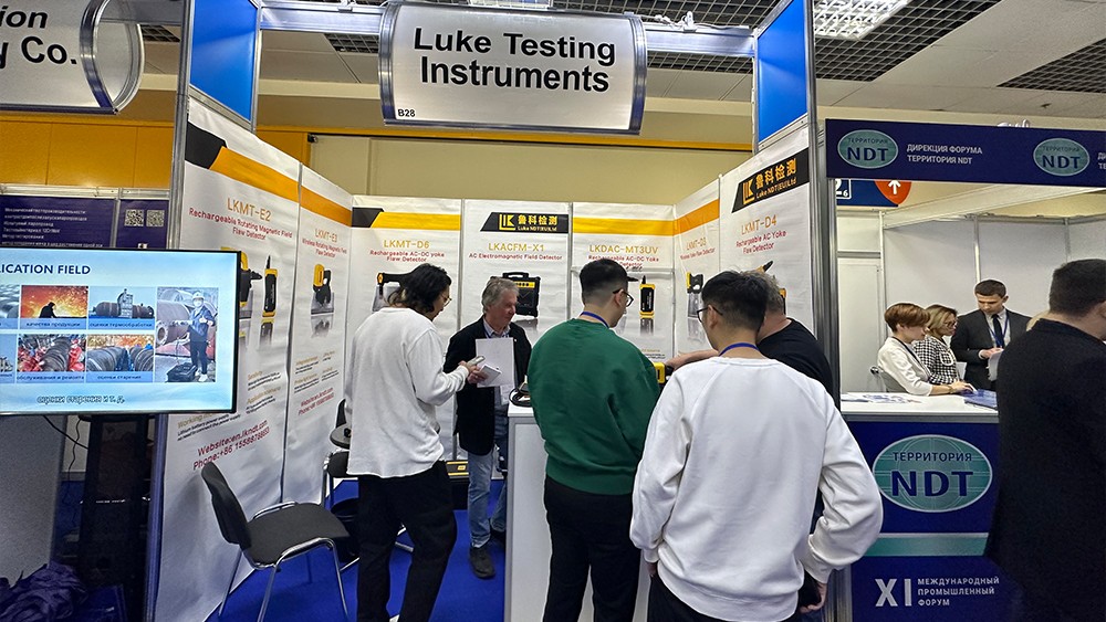 2024年4月15日,濟(jì)寧魯科檢測器材有限公司代表團(tuán)遠(yuǎn)赴俄羅斯莫斯科,參加2024年俄羅斯莫斯科NDT展。亮相本次展會的設(shè)備有聯(lián)合中國石油大學(xué)(華東)共同研發(fā)的ACFM交流電磁場檢測儀,自主研發(fā)的無線式磁粉探傷儀、管道磁粉探傷儀、角焊縫磁粉探傷儀、腐蝕測厚機(jī)器人等。儀器一經(jīng)亮相,便引起國際友人廣泛關(guān)注與一致好評。